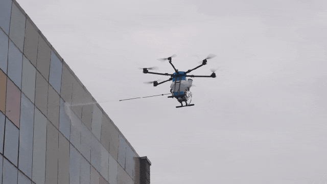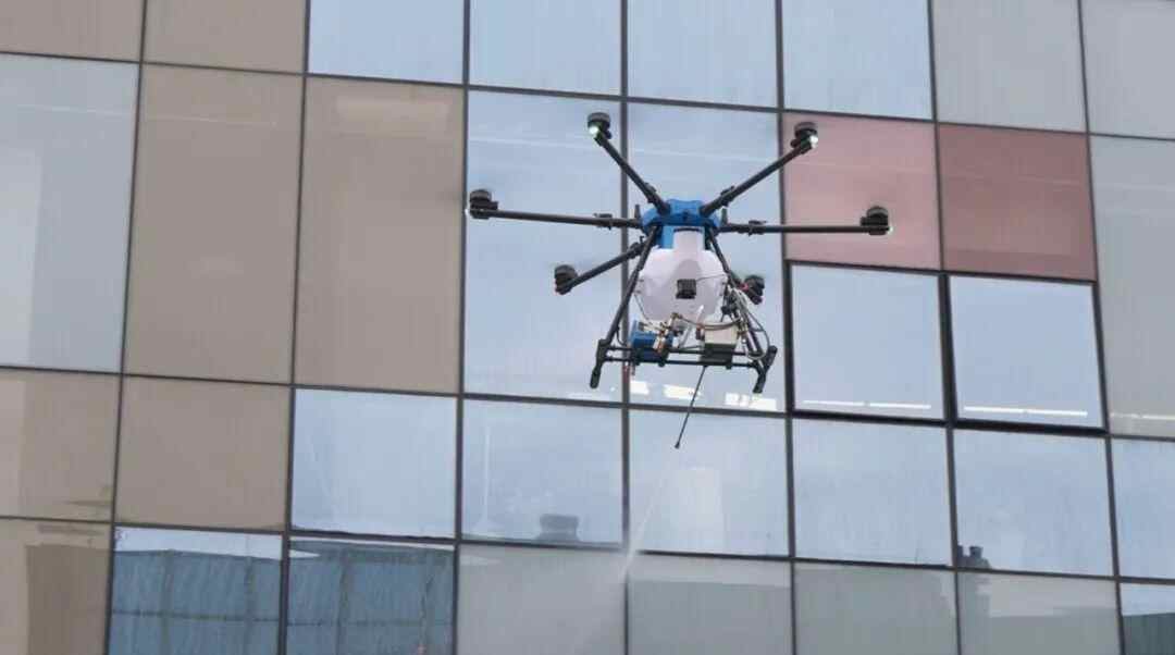 只见一道道细密的水雾从无人机下方喷出,清洁液被均匀地喷洒在玻璃幕墙上,利用其强大的高压喷水装置,无人机以一定的压力和角度对玻璃进行冲洗,整个过程高效而流畅。