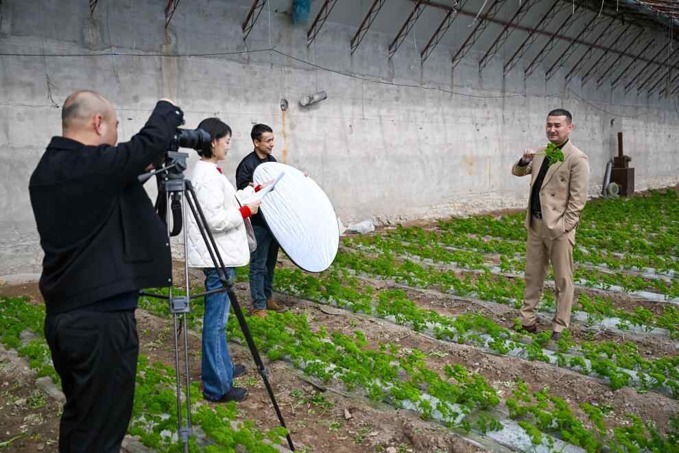 在新疆伊犁哈萨克自治州察布查尔锡伯自治县科技示范基地,依木拉·亚尔买买提(右)和团队在拍摄短视频(3月7日摄)。新华社记者 丁磊 摄