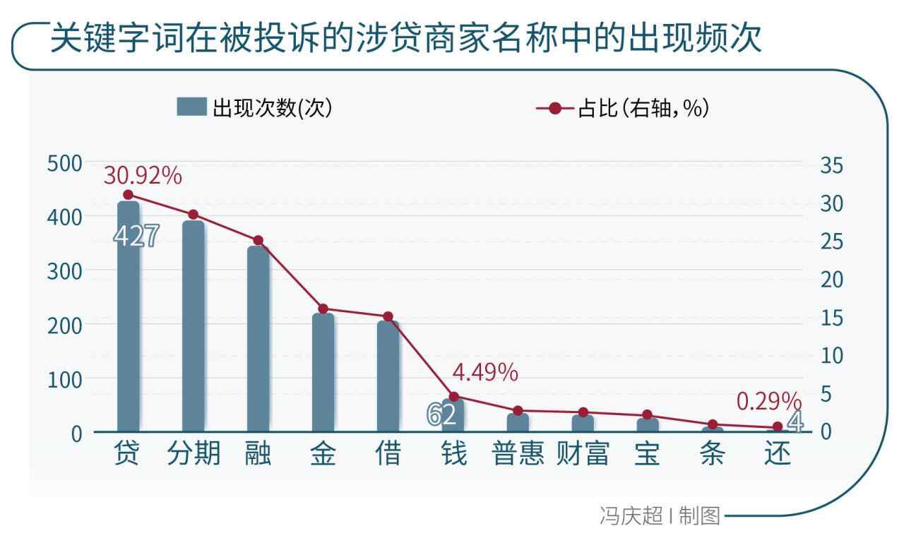 哪些字词最受“欢迎”?统计发现,名称中包含“贷”“分期”“融”的店家均超过300家位列前三,占比分别达到30.92%、28.31%和24.91%,“金”“借”出现的频数均超过200家,占比分别为15.93%和14.92%。以上5个关键字词的排列组合,合计覆盖了超过95%的“商家”,而其余6个关键字词出现的频度均不超过5%。