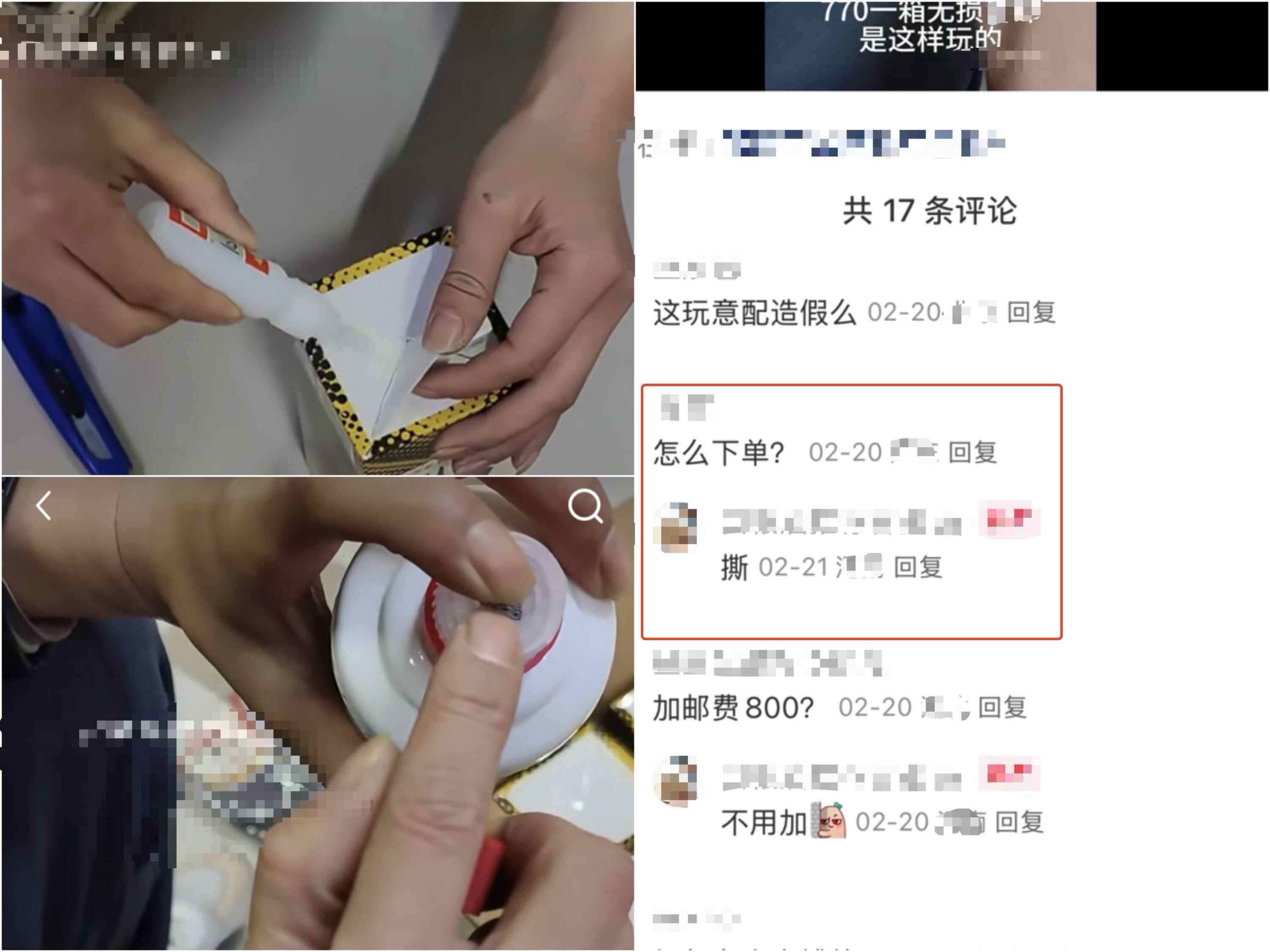 此外,在社交类平台上,一些视频博主会通过看似分享开盖酒、换瓶酒来源,分享真假酒鉴别等内容,实则在视频最后推销售卖开盒、开盖酒等。比如在账号名为“口粮酒推荐官张sir”发布的视频,包括怎么做无损酒,博主通过演示怎么将瓶子外盖打开,扫完内盖的二维码红包后再盖上外盖(内盖不打开),还演示如何用胶粘上盒子和铆钉复原,“品相完好,拿去请客没问题,原箱1100元,(扫完红包无损)770元”。当在后台留言如何购买,其回复“撕”(撕,网络用语:私聊的意思)。
