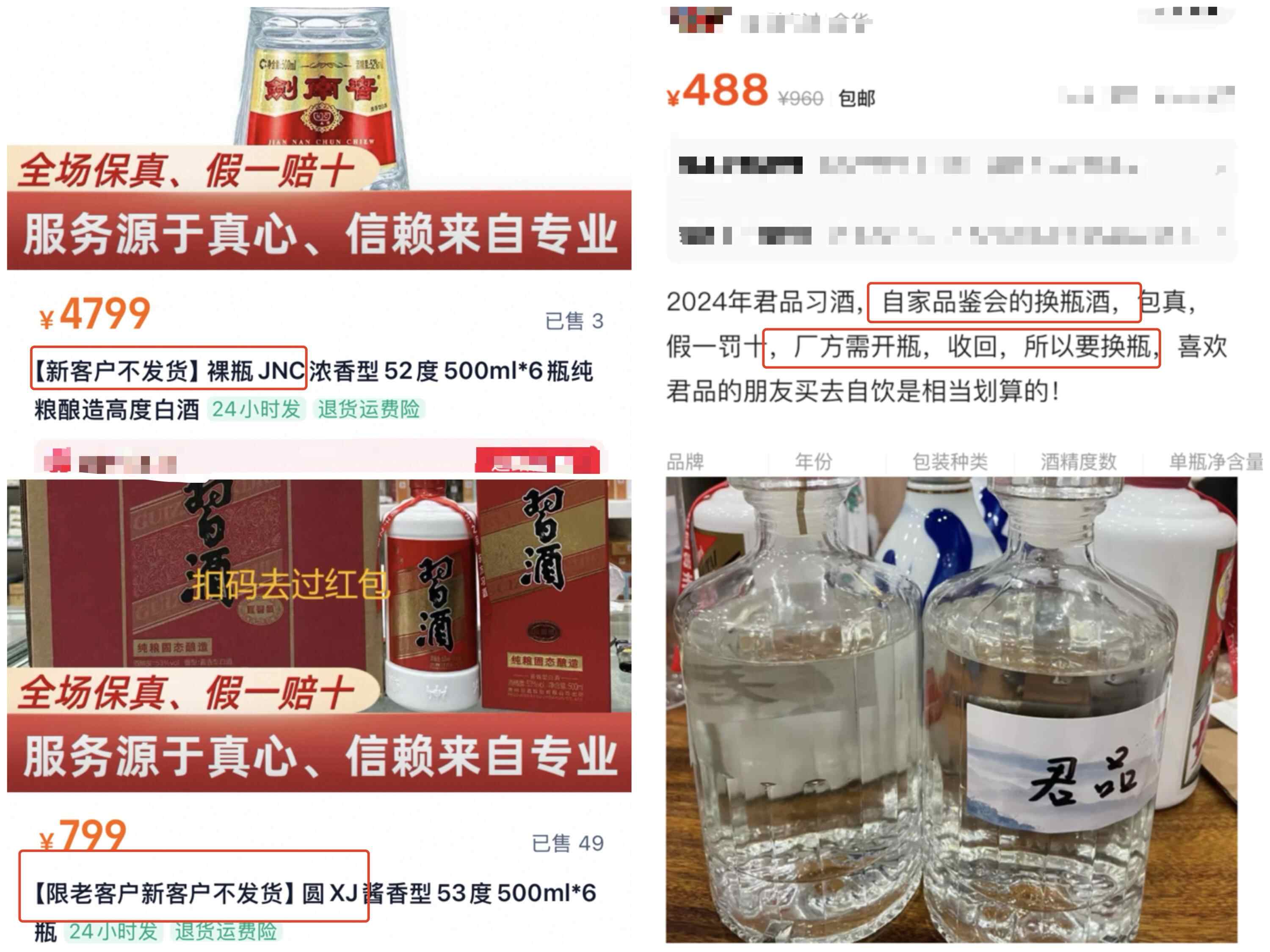 开盖酒、换盖酒、换瓶酒、拆盒光瓶酒.......产品包装不完整,但价格低至原装正品价一半,这样的“名酒核心畅销单品”你敢买吗?