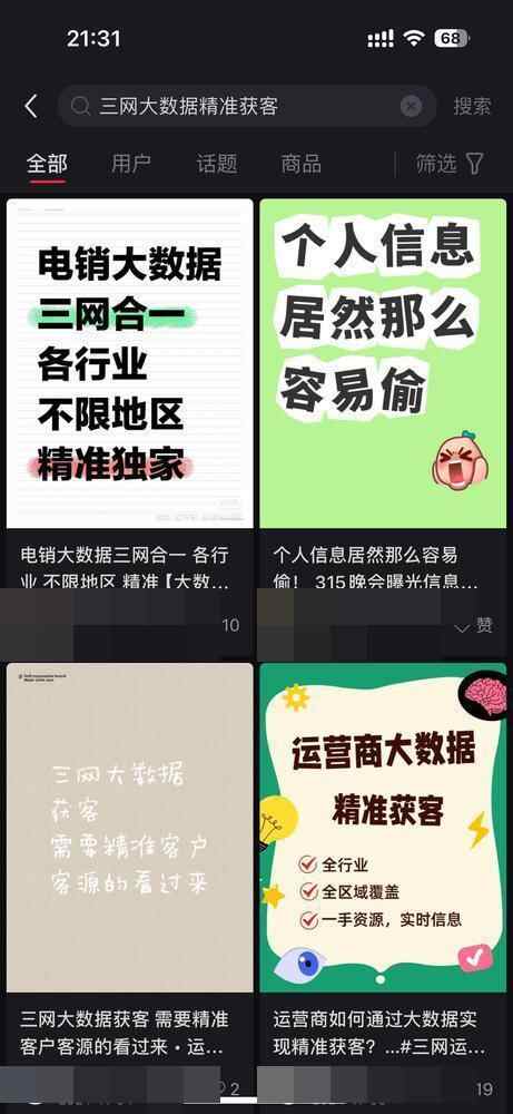 其中,商家可以通过短视频平台、微信公众号、三网通信等渠道精准获取用户个人信息。对此,羊城晚报记者通过“三网大数据精准获客”在小红书平台进行搜索,发现有多条帖子直接写着“电销大数据 三网合一 各行业 不选地区 精准独家”。这些账号多数ID为“小红署+数字后缀”(注册后自动生成的ID名)。