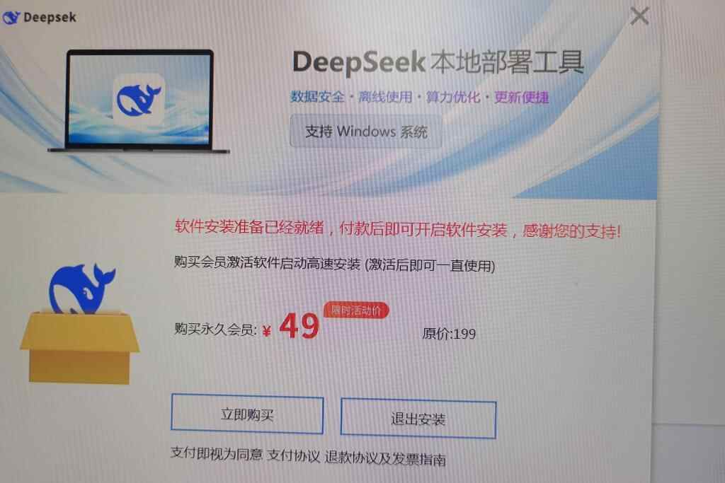 据刘女士描述,她在社交媒体上看到有博主介绍本地部署DeepSeek的诸多好处,便在搜索引擎中搜索攻略,搜索引擎给出了不少链接,写着“正版下载”“快捷安装”等。刘女士挑选其中一个链接进行了安装下载,其间,该软件还弹出了付费窗口,刘女士未加思索便支付了49元费用。