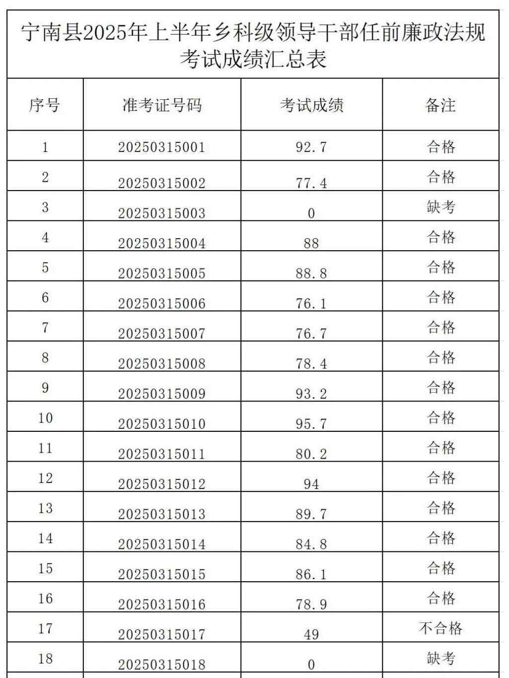 根据《宁南领导干部任前廉政法规考试工作办法》要求,3月15日,宁南县组织了全县乡科级领导干部任前廉政法规考试。考试成绩汇总表显示,当天应参考的乡科级领导干部共有195人,其中有20人分数低于60,考试成绩为不合格,另外还有6人缺考,考试成绩直接判为0分。