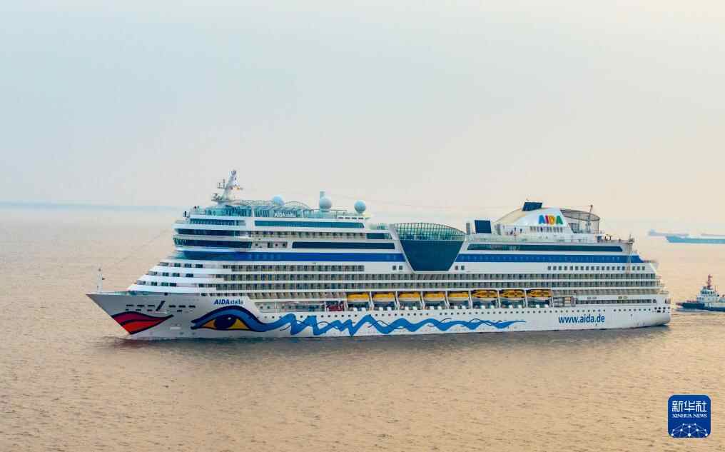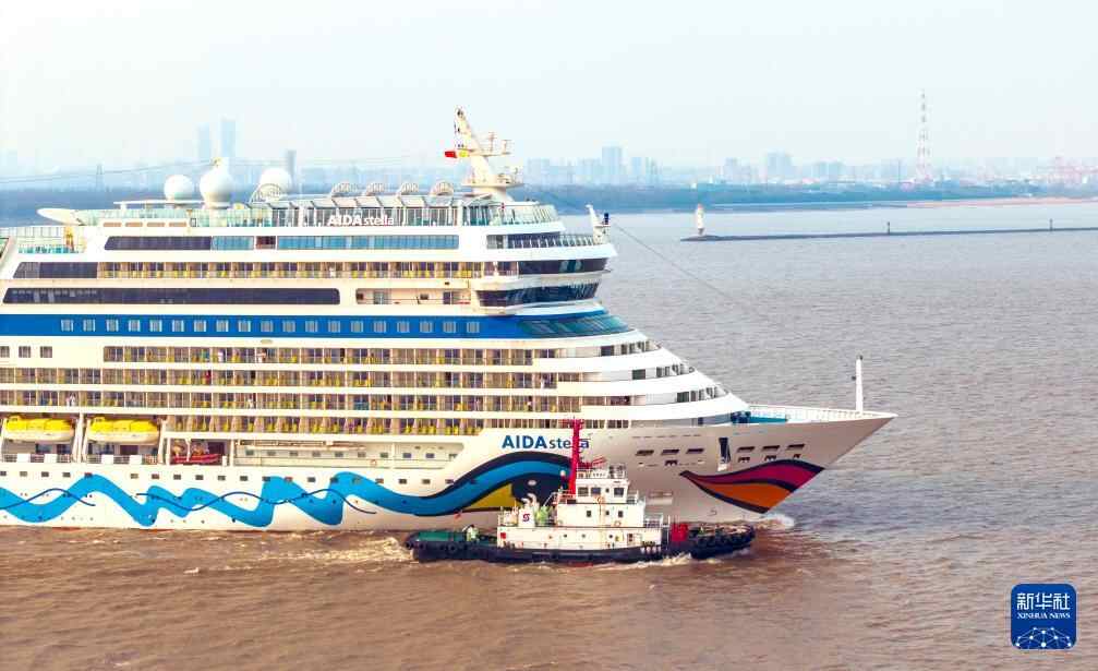 3月16日,“阿依达·星辰号”邮轮航行在上海吴淞口国际邮轮港水域(无人机照片)。 新华社发(朱嘉奕摄)