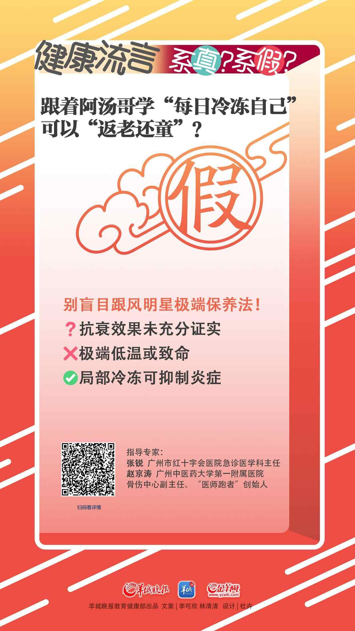 广州中医药大学第一附属医院骨伤中心副主任、“医师跑者”创始人赵京涛也认为,全身冷冻的抗衰老作用仍处于医学研究阶段,未有明确的科学结论。冷冻疗法之所以被关注,是因为低温可抑制炎症,而炎症被认为是导致组织损伤和衰老的一个重要因素。“明星的愿望是美好的,但是否真的能延缓衰老、延长寿命,还需要更深入的研究。”赵京涛说。