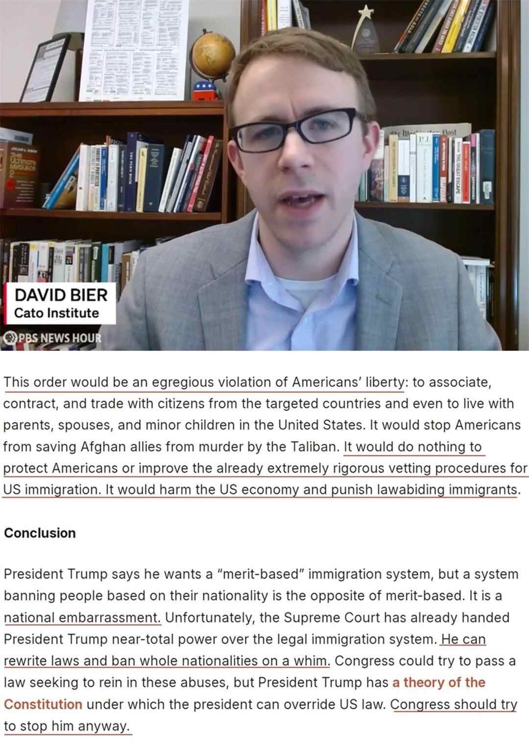 报告还指出,实施签证限制政策既不会让美国人更安全,也无助于改善本已非常严苛的美国移民审查制度,反而会严重侵犯美国人的自由,同时将损害美国经济并给守法移民带来伤害。