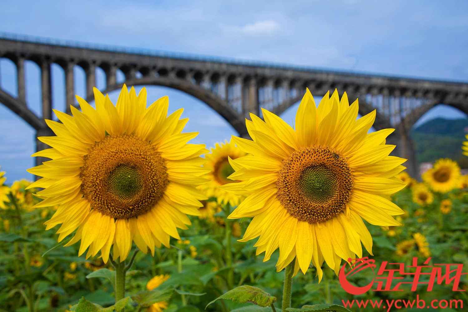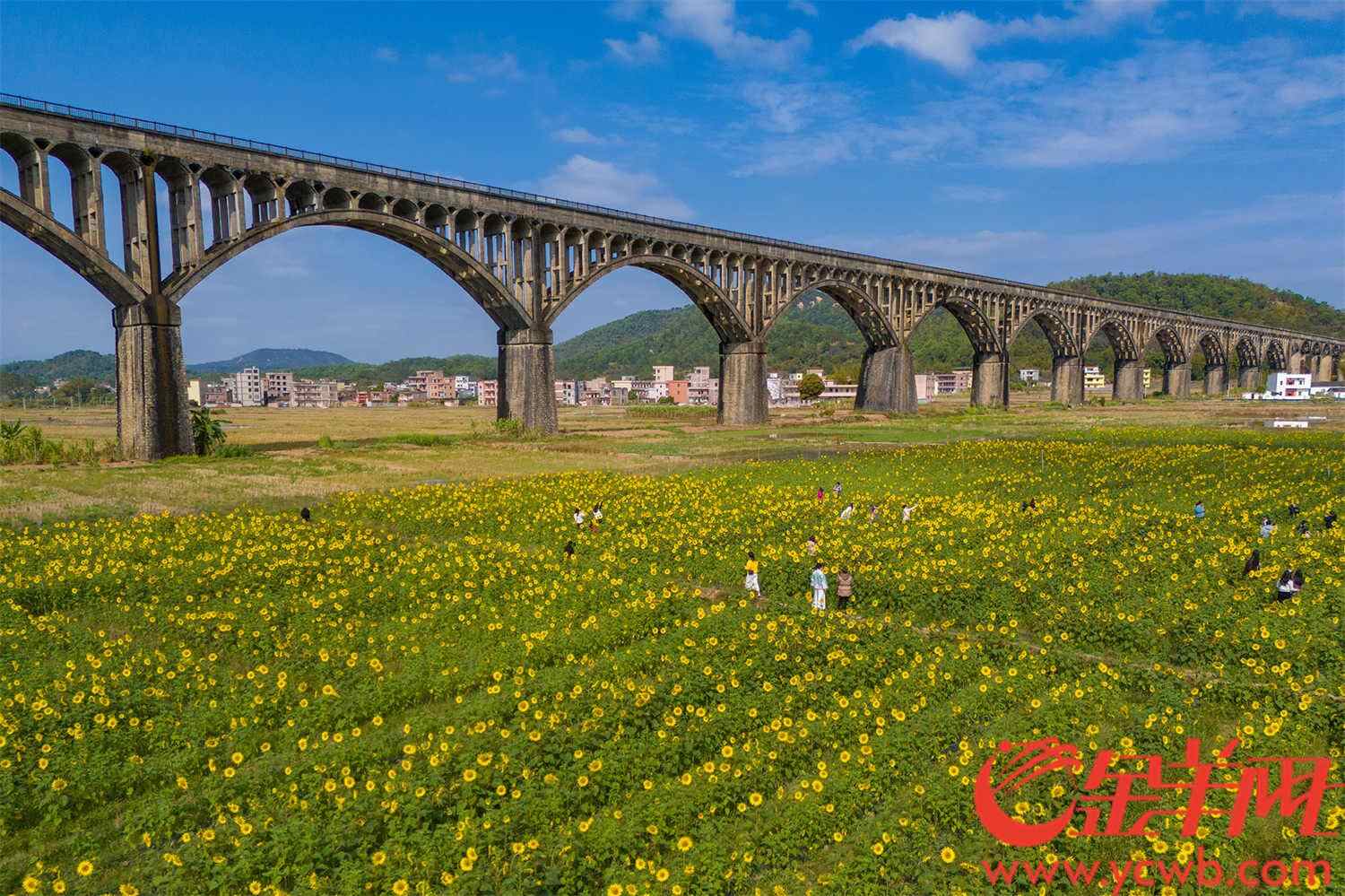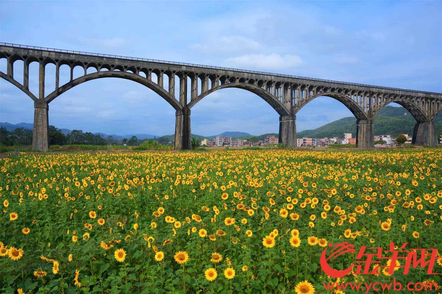 在长岗坡渡槽的弧形拱廊下,春天在这里演奏光的赋格。近五十载风雨洗礼的灰白渡槽,被大片大片的向日葵围绕,勾勒着乡村振兴的金色画卷。花盘随着太阳转动,恰与曾经建设的测量员三脚架身影重叠。阳光下,混凝土水渠同嗡嗡飞舞的蜜蜂共鸣,金色春水从水渠上倾泻而出在这片土地上蔓延。