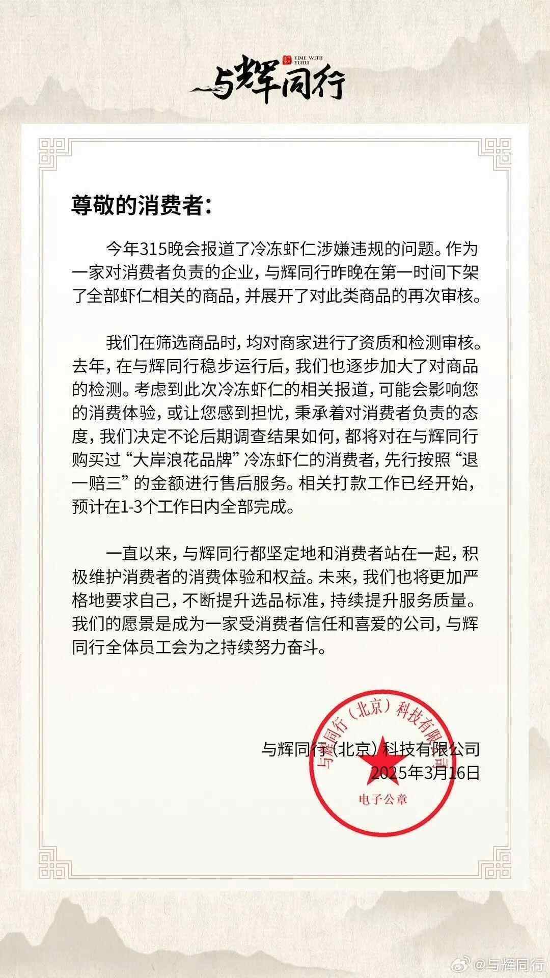 3月17日,在社交平台有多位消费者晒单,称已收到与辉同行对冷冻虾仁的赔付金。第三方数据平台显示,与辉同行2024年至今,带货“大岸浪花”虾仁销售额总计约500万元,按退一赔三计算,此次赔付金额或近2000万元。