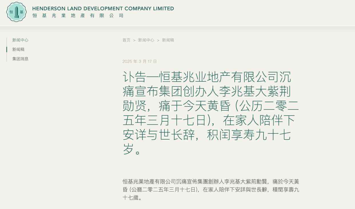 3月17日,据恒基兆业地产官网发布消息称,“恒基兆业地产有限公司沉痛宣布集团创办人李兆基大紫荆勋贤,痛于今天黄昏 (公历二零二五年三月十七日),在家人陪伴下安详与世长辞,积闰享寿九十七岁。”