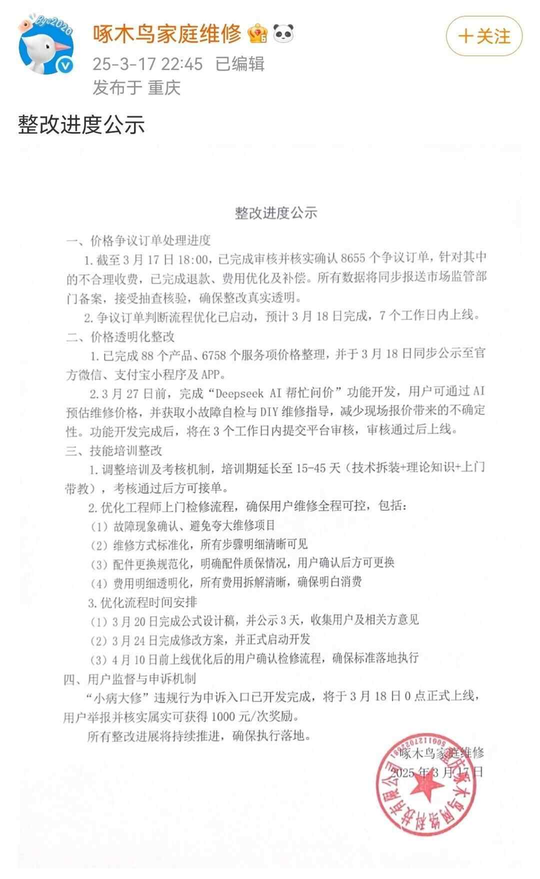此外,“啄木鸟”还表示,将于3月27日前,完成“DeepSeek AI 帮忙问价”功能开发,帮助用户减少现场报价带来的不确定性;调整培训及考核机制,培训期延长至15—45天;维修方式标准化,所有步骤明细清晰可见等。