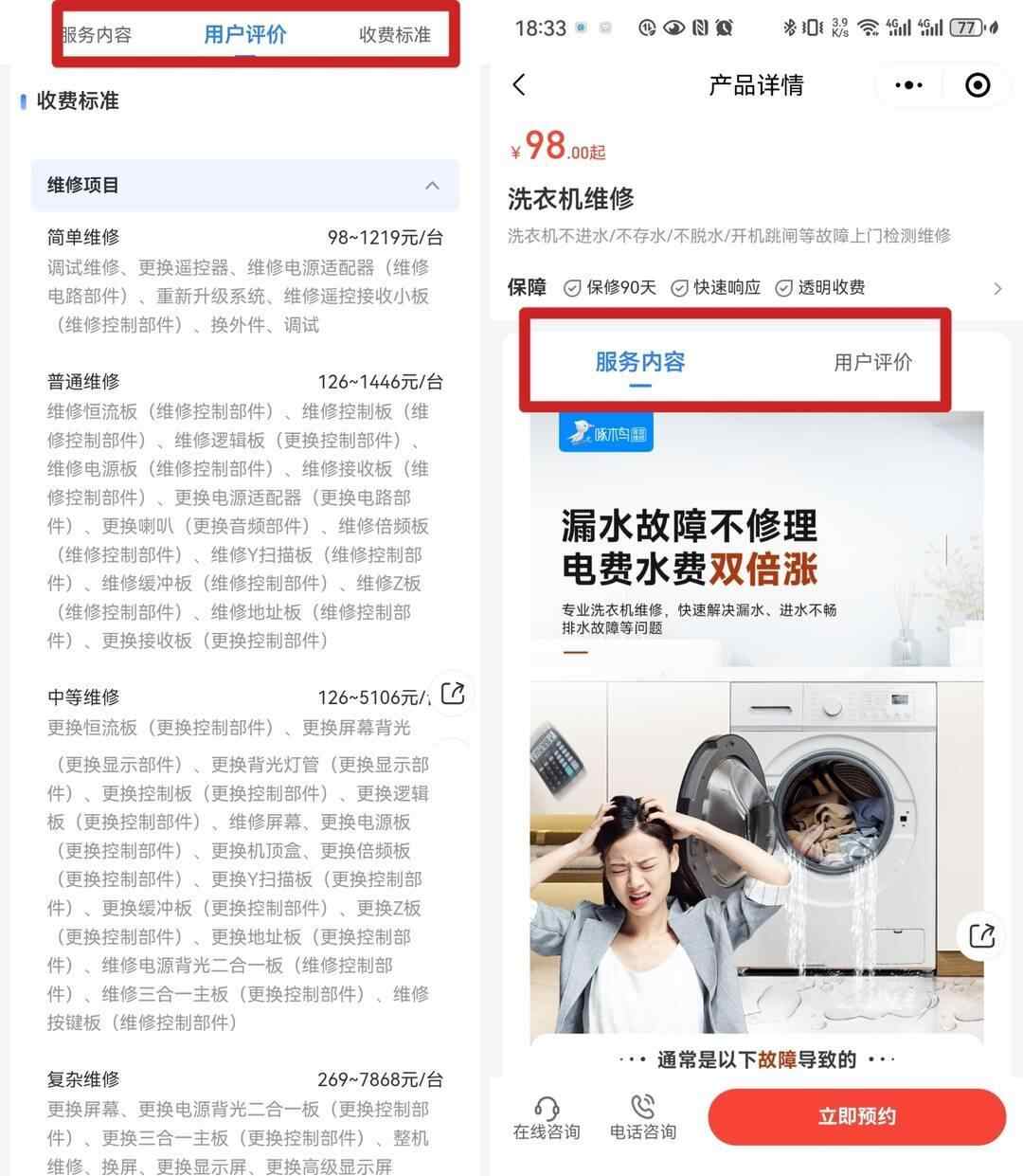 记者随机点进一个报修界面,除了报修信息填写外,界面内还显示了维修的“收费标准”。