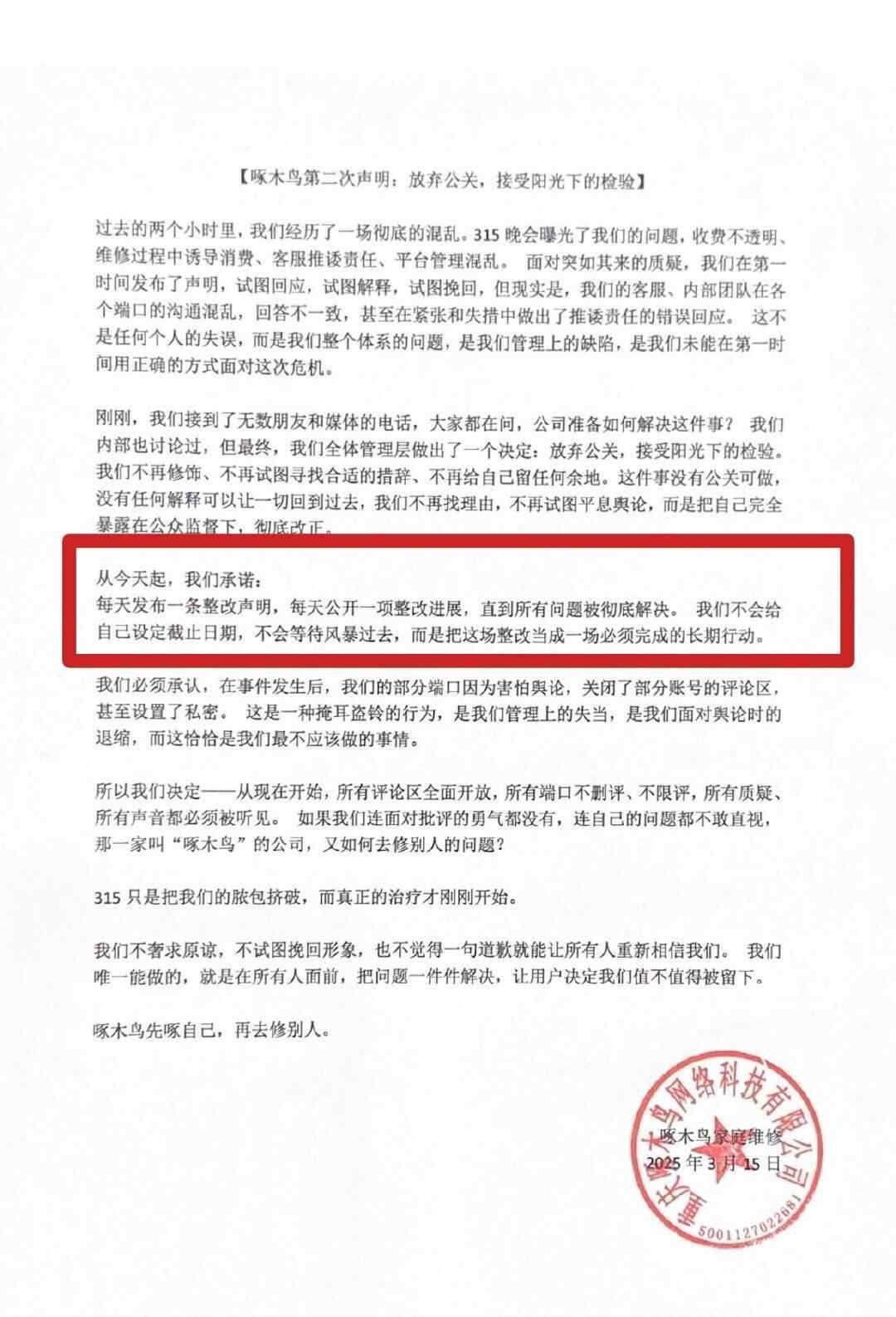 “小病大修、收费不透明、质保困难……”今年央视“3·15”晚会曝光了啄木鸟家庭维修平台存在诸多收费乱象。事后,从3月15日晚到3月17日,啄木鸟家庭维修官方微博连发多条致歉声明。第三条声明更是承诺“每天发布一条整改声明,每天公开一项整改进展,直到所有问题被彻底解决”。