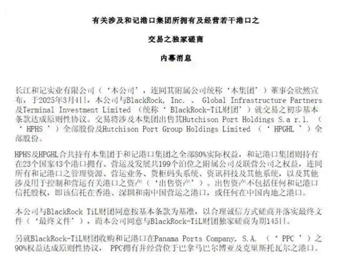 据报道,日前,李嘉诚旗下香港长江和记实业有限公司拟向美国贝莱德牵头的财团转让其持有和运营的,分布于23个国家的43个港口,其中包括巴拿马运河两端的港口。