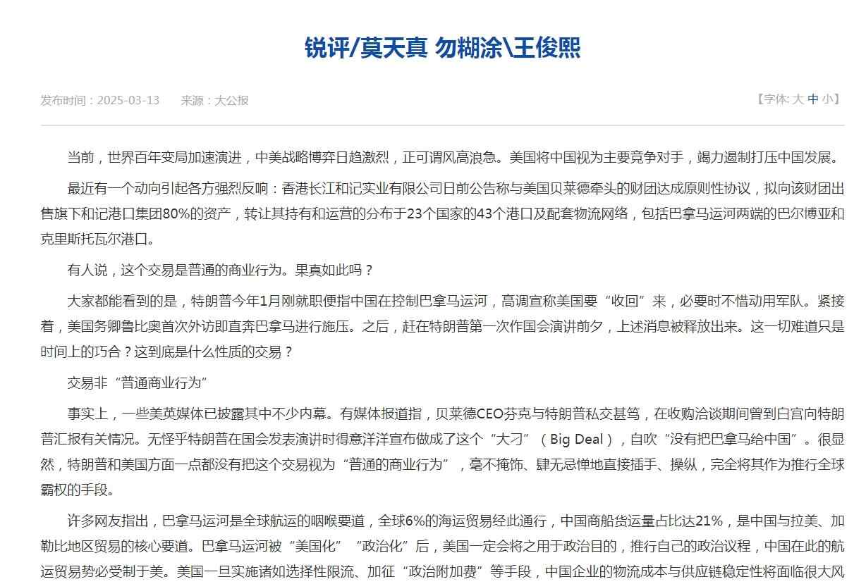 文章指出,美国或将以此交易为“范本”,控制世界更多关键港口,并用“长臂管辖”实施打压手段,让中国船舶“无处可靠”。
