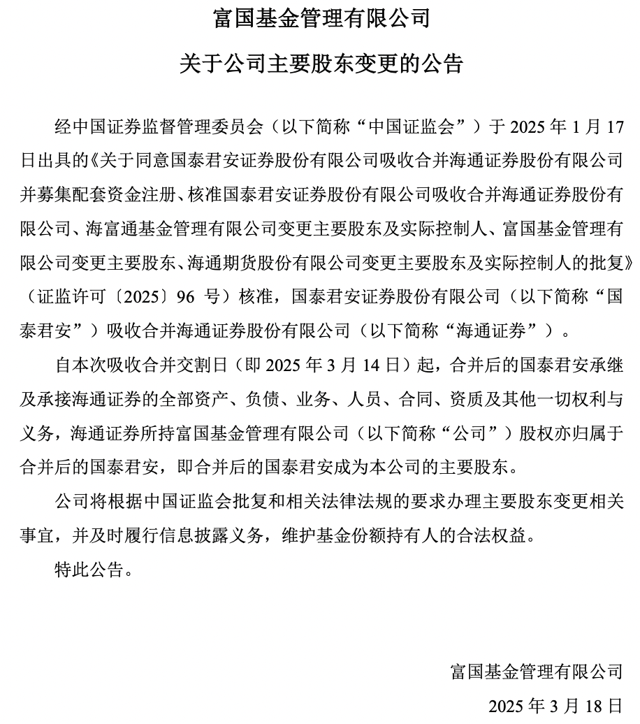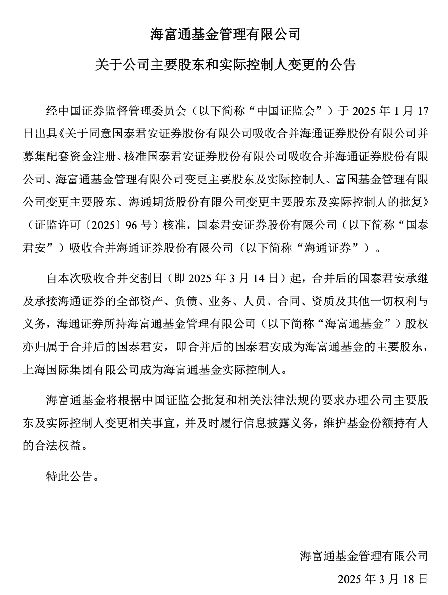 公告内容显示,自此次吸收合并交割日(3月14日)起, 合并后的国泰君安承继及承接海通证券的全部资产、负债、业务、人员、合同、资质及其他一切权利与义务,海通证券所持富国基金、海富通基金股权亦归属于合并后的国泰君安,即合并后的国泰君安成为上述公司的主要股东。