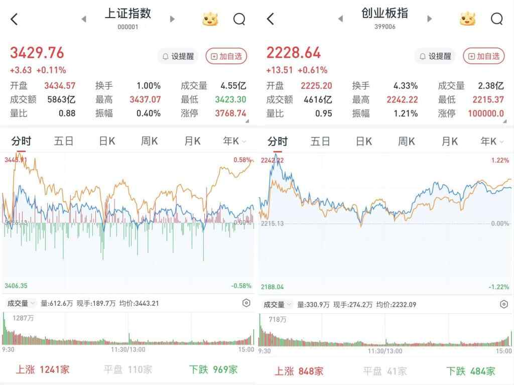 至收盘,上证综指涨0.11%,报3429.76点;科创50指数涨0.61%,报1089.83点;深证成指涨0.52%,报11014.75点;创业板指涨0.61%,报2228.64点。