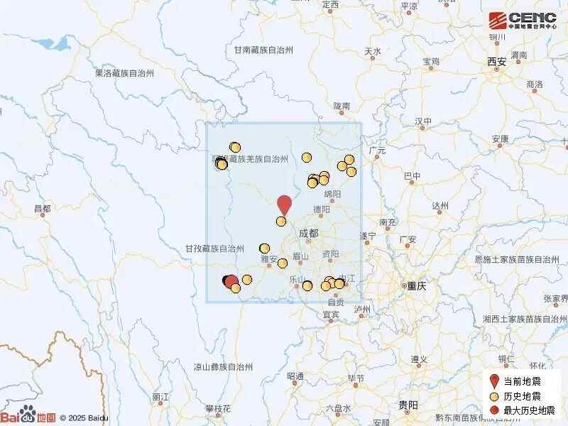 历史地震:根据中国地震台网速报目录,震中周边200公里内近5年来发生3级以上地震共169次,最大地震是2022年9月5日在四川甘孜州泸定县发生的6.8级地震(距离本次震中224公里),按震级大小前50次历史地震分布如图。