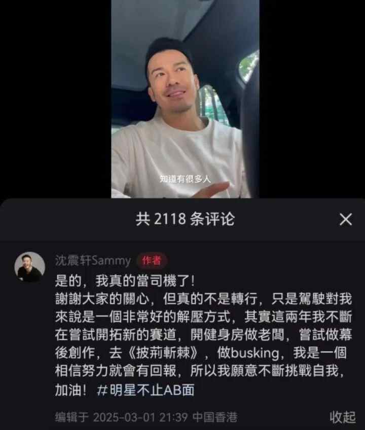 据报道,香港41岁TVB演员沈震轩转行开网约车被多名网友偶遇。2025年3月1日晚,沈震轩在自己的社交账号上发布了一个视频,标题是《是的,我真的当司机了》。