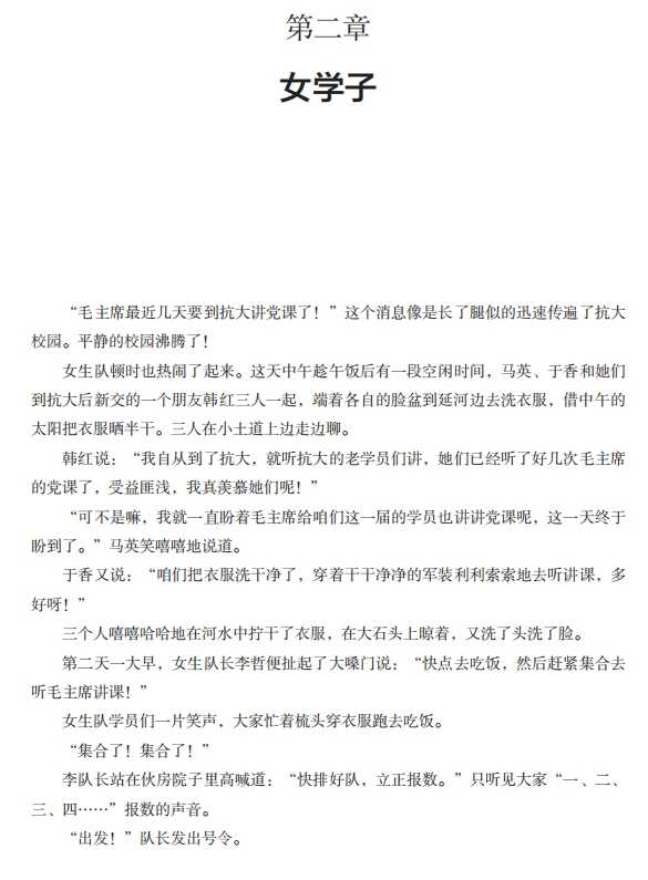 小说以马英的视角切入,她从陕西榆林女子师范学校离开后,奔向革命摇篮延安,由此与沈青的命运发生交集,展开了发生在抗大的感人故事。