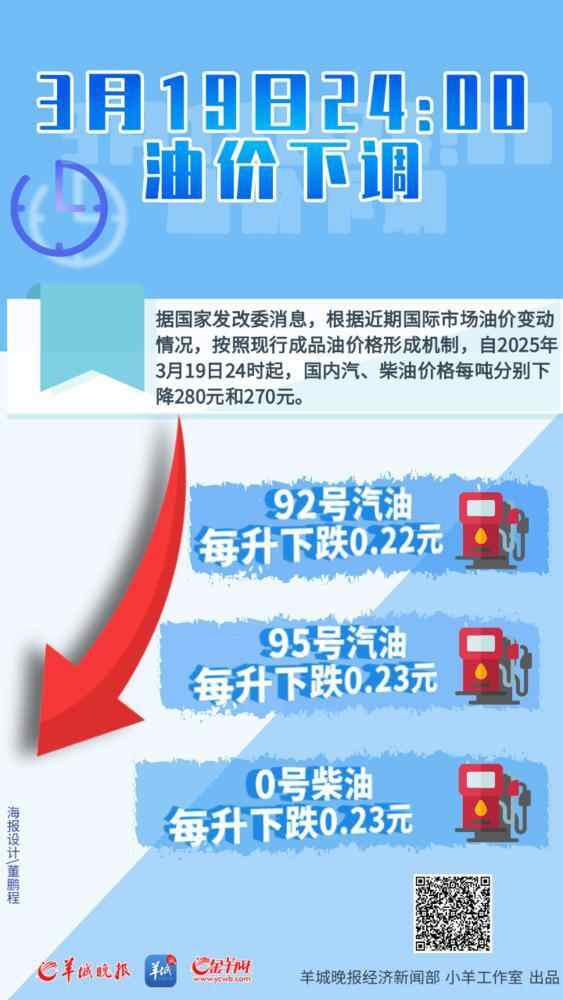 3月19日,羊城晚报记者从国家发改委官网获悉,根据近期国际市场油价变动情况,按照现行成品油价格形成机制,自2025年3月19日24时起,国内汽、柴油价格(标准品,下同)每吨分别下降280元和270元。折升价92#汽油、95#汽油、0#柴油分别下调0.22元、0.23元、0.23元。