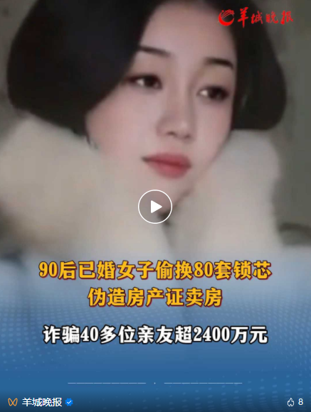 据@央视社会与法 3月18日报道,甘肃兰州一女子伪造一百多本房产证,更换一整栋楼的房门锁芯,自称是“单位内部优惠购房”,将这些房子“卖”给亲戚朋友骗取2400多万元,可为她卖房还债的老公根本不知情。