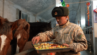 完成春晚连线出镜之后,军马们回到马厩,一顿专属年夜饭正等待着它们。
