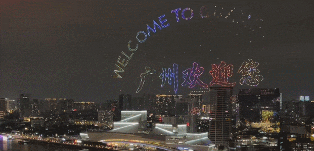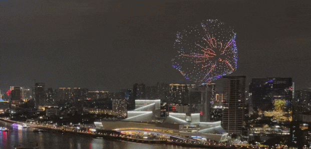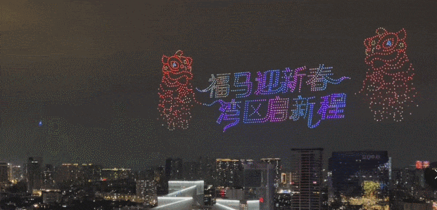 无人机编队首先演绎了岭南神兽“鳌鱼”,以其“独占鳌头”之姿,礼赞广州奋勇争先、追求卓越的精气神。随后,“2026新春好”的温暖祝福点亮夜空。紧接着,一朵巨大的木棉花凌空盛放,英雄花开英雄城,金色花蕊流光闪烁,宛如夜空中一枚璀璨的英雄勋章,象征着这座城市坚韧不拔、蓬勃向上的精神风貌,在岁末年初的夜空里,为奋进的时代献上最热烈的礼赞。