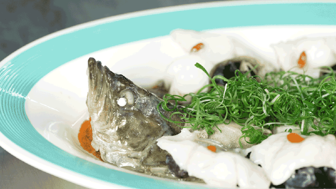 2. 备鱼碟一只,鱼肉捞味盐3g,下蛋白稀浆(鸡蛋白和生粉调制的糊)捞匀,鱼骨下盐3g捞匀,碟的一头放鱼头,接着放鱼骨,再放鱼尾造型,洒上姜丝。