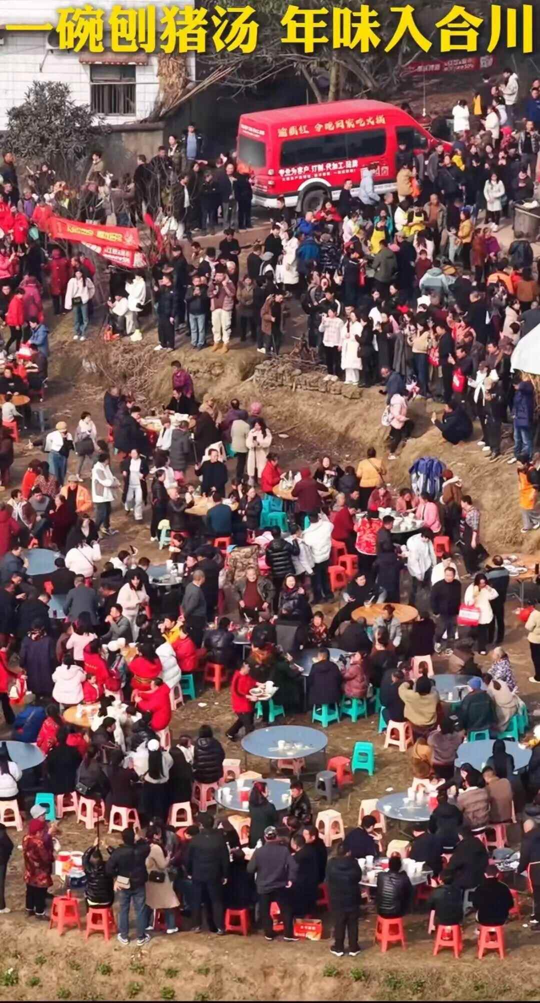 当天,上千人涌入这个小村庄来吃刨猪汤,村里田间地头都坐满了人。据合川宣传部门,1月10日-11日,现场群众1000余人参与活动,除了杀猪、吃流水席,现场还有舞龙、放烟花,宛如过年;1月12日晚,目测现场群众2000余人参与,各级自媒体达人100余人。呆呆本人进行了直播,实时在线人数超过10万。