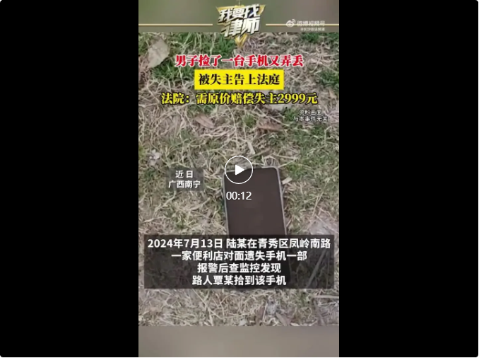 近日,广西南宁。男子陆某在外出时丢失一部手机,报警后,警方通过监控发现手机被覃某捡到。陆某上门索还却被对方告知,自己因喝醉酒将手机遗失,陆某认为覃某未履行妥善保管义务,要求照价赔偿,被覃某拒绝。