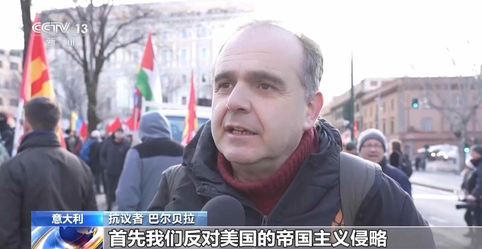 总台记者 殷欣:游行队伍从罗马市中心的一处广场出发,一直朝着美国驻意大利大使馆方向行进。在我身后,道路的尽头,就是美国驻意大利大使馆。现场可以看到,由于警方封锁了大使馆附近的道路,游行队伍并不能靠近大使馆。尽管如此,现场的示威者依旧对美国向委内瑞拉发动袭击表示了强烈谴责。