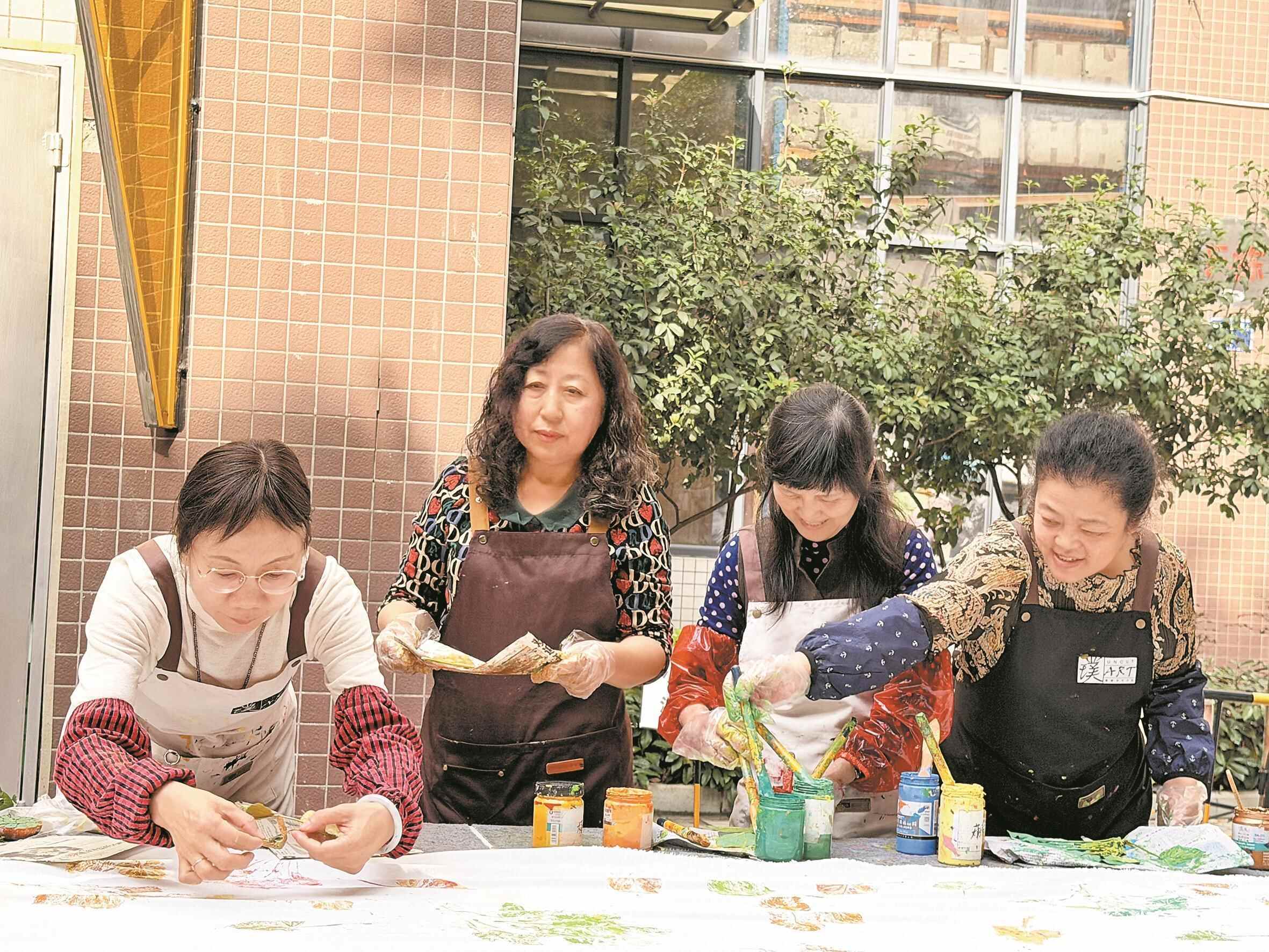 创作的过程中,有很多小区的孩子跑来凑热闹,他们拿着颜料,在布上肆意涂抹,把原本规整的印染图案弄得乱七八糟。可曾玲一点也不觉得乱,反而觉得那些歪歪扭扭的线条,充满了童真和活力。有妈妈甚至把包裹黄瓜的袋子拿来印染,意外地印出了独特的纹理。