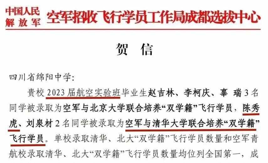 高中时,陈秀虎就读于绵阳中学航空实验班,曾荣获“绵阳市三好学生”。2023年7月,他以第一名8.98的招飞心品测试成绩(满分9分),良好的身体素质和扎实的文化基础通过空军招飞,进入清华大学航天航空学院飞行学员班,成为“双学籍”飞行学员。