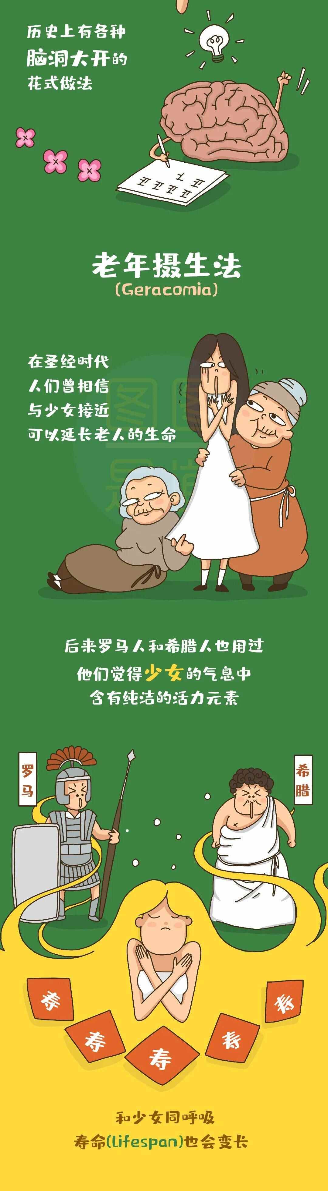 老年摄生法、寻找不死仙丹、注射睾丸分泌物、喝大量酸奶、睾丸移植术......从古至今人类对长生不老的追求却没有停止过,历史上有各种脑洞大开的花式做法,一起来看看吧!