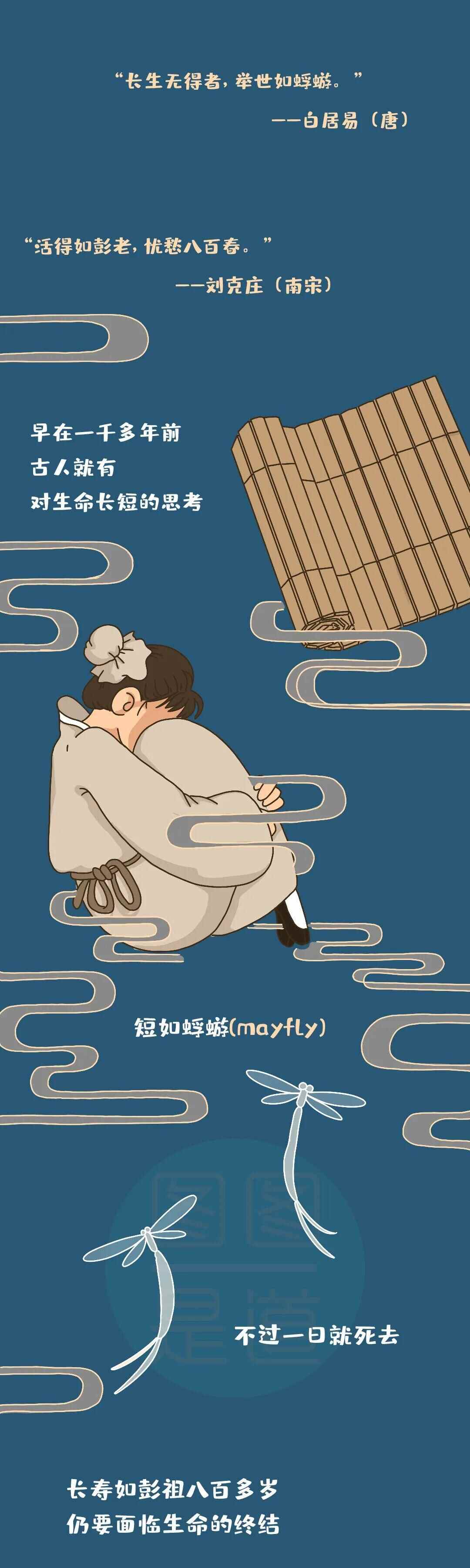 “长生无得者,举世如蜉蝣”“活得如彭老,忧愁八百春”,早在一千多年前,古人就有对生命长短的思考,短如蜉蝣,不过一日就死去,长寿如彭祖八百多岁,仍要面临生命的终结。