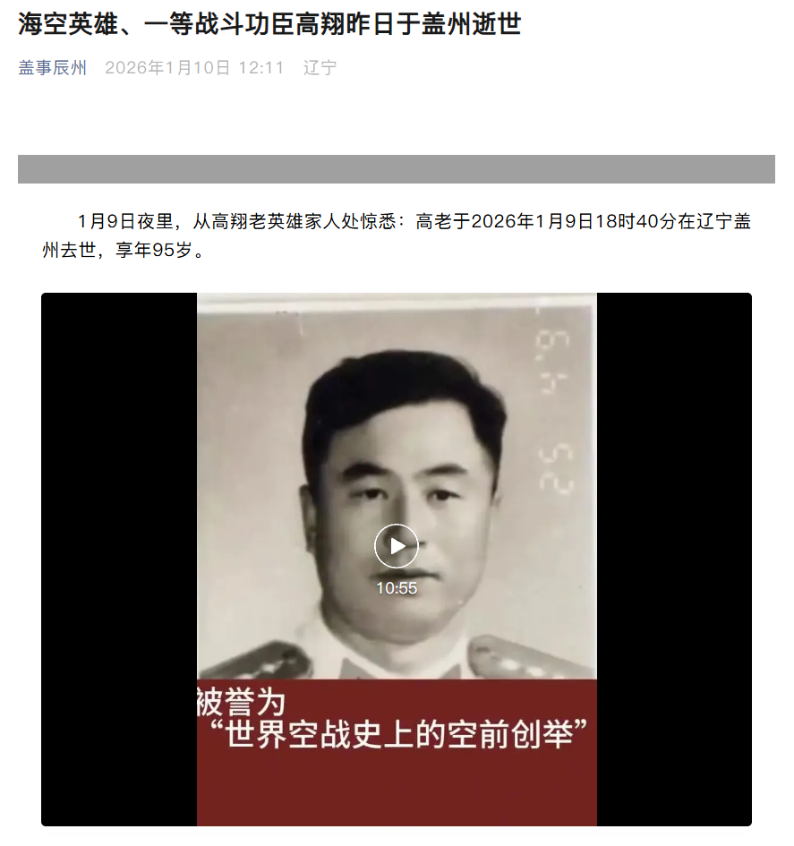 据辽宁营口盖州市委宣传部官方微信公众号消息,海空英雄、一等战斗功臣高翔于2026年1月9日18时40分在辽宁盖州去世,享年95岁。