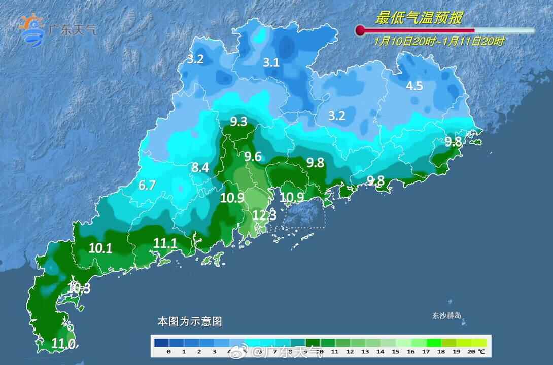 ◆气温小幅下降,防寒保暖不能松懈!预计,11日,广东大部晴间多云;12日受高空槽前西南气流影响,珠三角南部和粤东市县多云到阴天,有分散性零星小雨,其余市县晴转多云;13日,粤东南部沿海市县零星小雨转晴到多云,其余市县晴到多云。