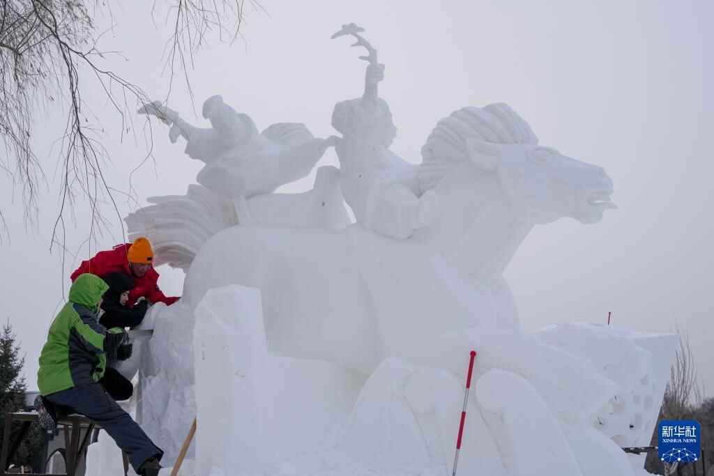 1月8日,在哈尔滨太阳岛雪博会第28届中国·哈尔滨国际雪雕比赛现场,选手进行雪雕创作。