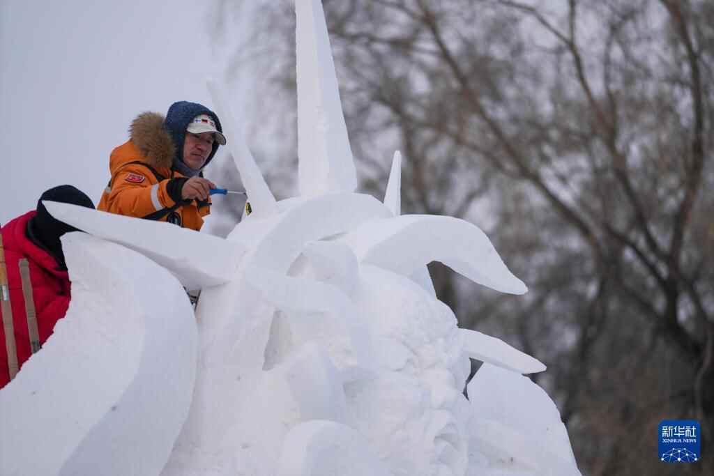 1月8日,在哈尔滨太阳岛雪博会第28届中国·哈尔滨国际雪雕比赛现场,选手进行雪雕创作。