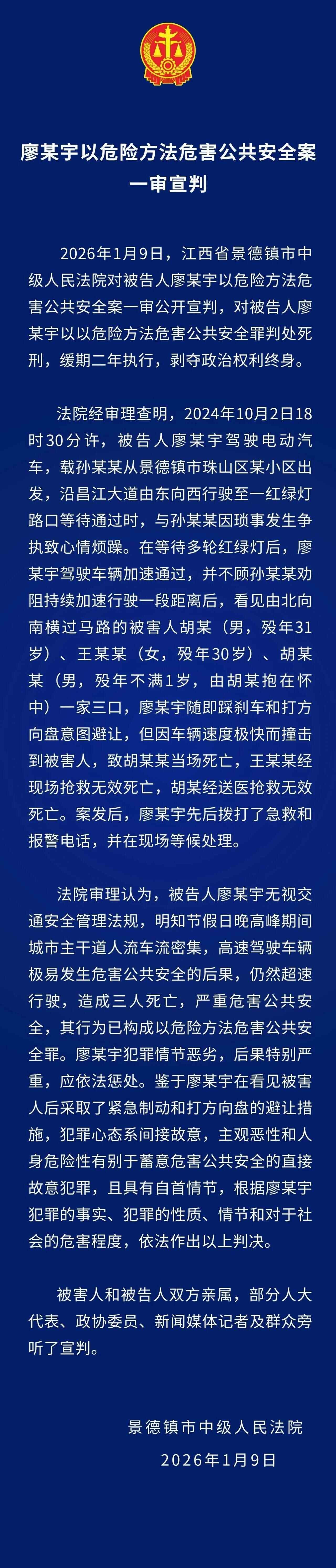 1月9日上午,江西省景德镇市中级人民法院对廖某宇以危险方法危害公共安全案进行宣判。