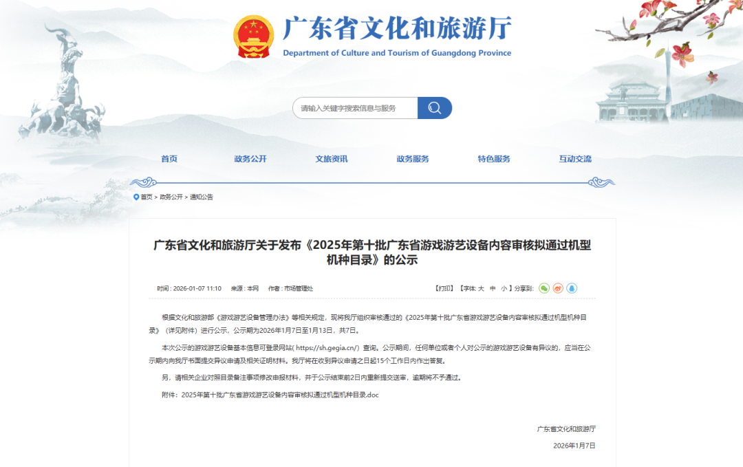 1月7日,广东省文化和旅游厅根据文化和旅游部《游戏游艺设备管理办法》等相关规定,发布《2025年第十批广东省游戏游艺设备内容审核拟通过机型机种目录》的公示,公示期为2026年1月7日至1月13日,共7日。