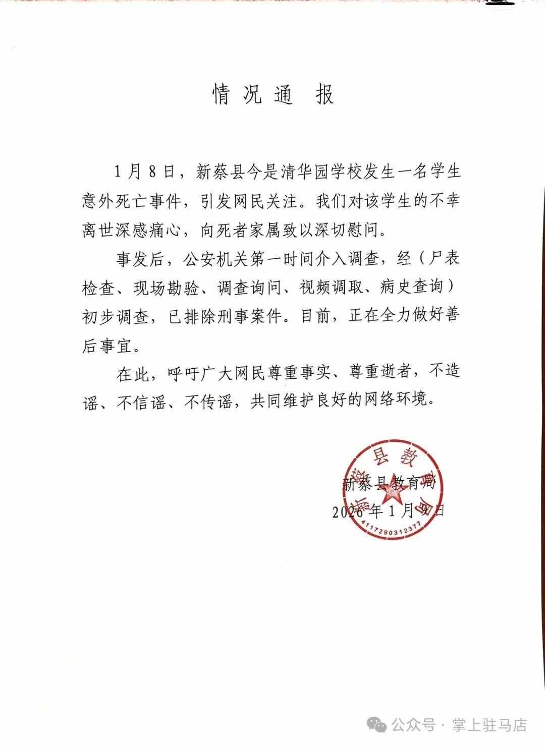 1月9日,“掌上驻马店”微信公众号发布情况通报: