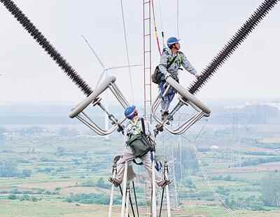安徽省滁州市柳巷镇,检修人员在100多米的高空进行检修作业,确保“西电东送”特高压大动脉安全稳定运行。宋卫星摄(影像中国)