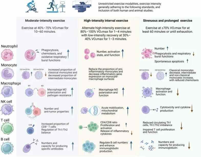 在以运动负荷为核心的综述中,研究者明确区分了“强度”和“总量”这两个概念:在推荐范围内的高强度间歇训练,并不会破坏免疫稳态;但当高强度训练持续时间延长、频率增加、恢复不足时,多类免疫细胞在外周血中的数量和功能下降,可持续3到72小时。