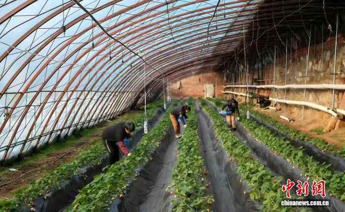 冬日时节,走进山西晋城高平市米山镇侯家庄村璟禾草莓采摘园的温室大棚,颗颗饱满、色泽鲜红的草莓新鲜上市,村民们穿梭在田垄间,轻轻采摘成熟的草莓,然后分拣、装盒,送往订购商手中。