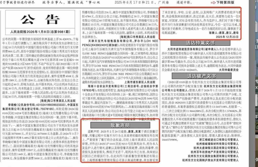 1月8日,记者注意到,海底捞小便当事人唐某及其父母在《人民法院报》3版登报道歉。