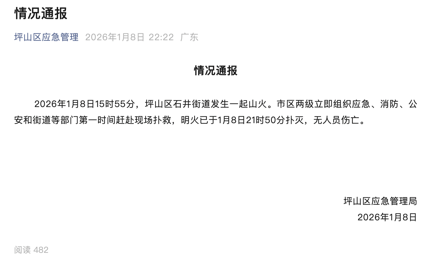 1月8日22时20分,深圳市坪山区应急管理局发布情况通报:2026年1月8日15时55分,坪山区石井街道发生一起山火。市区两级立即组织应急、消防、公安和街道等部门第一时间赶赴现场扑救,明火已于1月8日21时50分扑灭,无人员伤亡。
