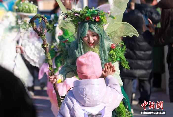 1月2日,元旦假期,乌镇戏剧节开年大巡游——《艾尔夫奇境之旅》在北京城市副中心商业地标——“湾里”上演。图为巡游演员与市民互动合影。中新社记者 贾天勇 摄
