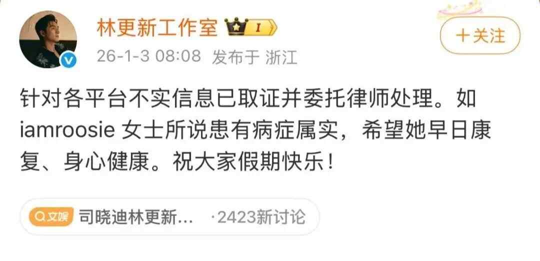林更新工作室发文:针对各平台不实信息已取证并委托律师处理。如 iamroosie 女士所说患有病症属实,希望她早日康复、身心健康。祝大家假期快乐!